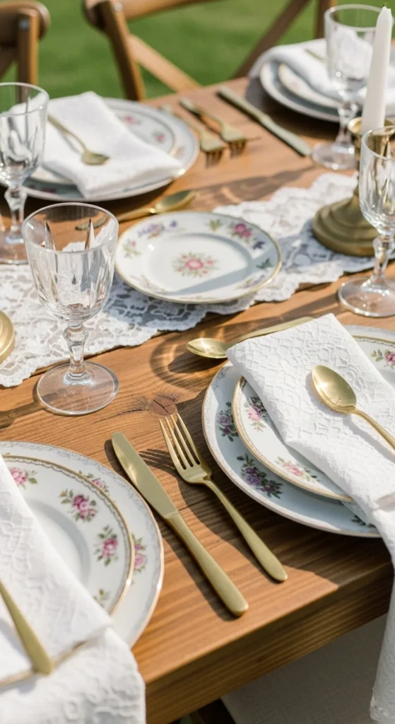 Vintage china adds storybook charm to your tables. Rent or collect sets from thrift shops for an eclectic mix. Pair with lace and gold for elegance. Each setting feels personal and nostalgic — perfect for garden or countryside weddings.