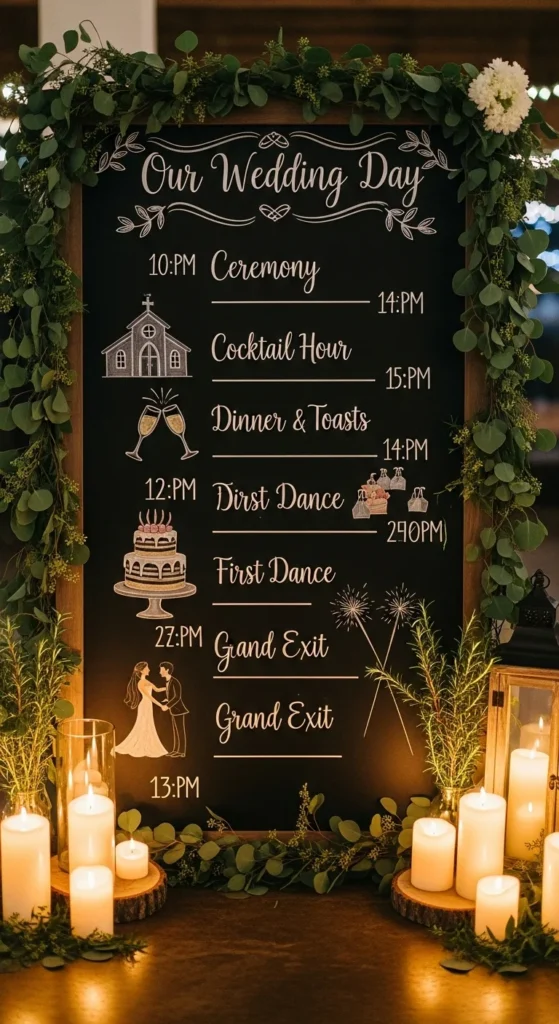 A timeline keeps guests informed and entertained. Illustrate key moments — ceremony, dinner, first dance — in a creative way. Use chalk pens for clean lines. It’s functional art that also adds character near your venue entrance.