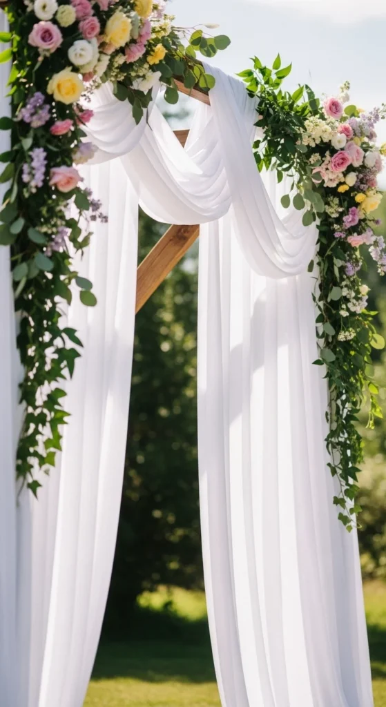 A draped backdrop creates elegance with minimal effort. Lightweight fabric catches the breeze beautifully. Perfect for beach or garden ceremonies, it frames the couple softly and enhances every photograph.