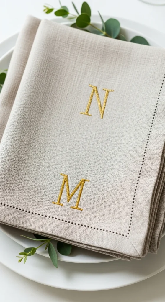 Embroidered napkins add sophistication. Have initials or your wedding date stitched in subtle tones. Use linen or cotton for texture. These double as keepsakes for close family or your sweetheart table.