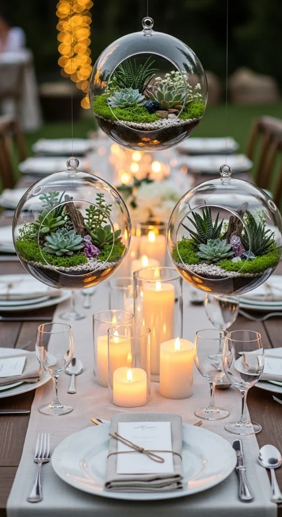 Terrariums add charm and depth to vertical space. Fill them with plants, candles, or fairy lights. They suit modern, boho, or garden weddings perfectly. Lightweight and reusable, they’re an eco-friendly decor option.