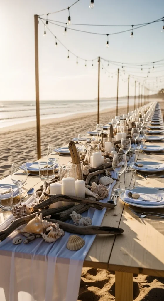 Driftwood adds a natural coastal vibe. It pairs beautifully with soft blues, whites, and sandy tones. Combine with candles or succulents for texture. Perfect for seaside ceremonies or destination weddings.