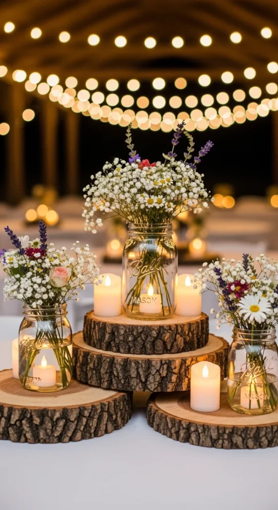 Mason jars are timeless and budget-friendly. Fill them with flowers, fairy lights, or candles. Group in sets of three for visual balance. Tie twine or lace around the rims for rustic texture — simple yet beautiful decor that fits any casual wedding theme.
