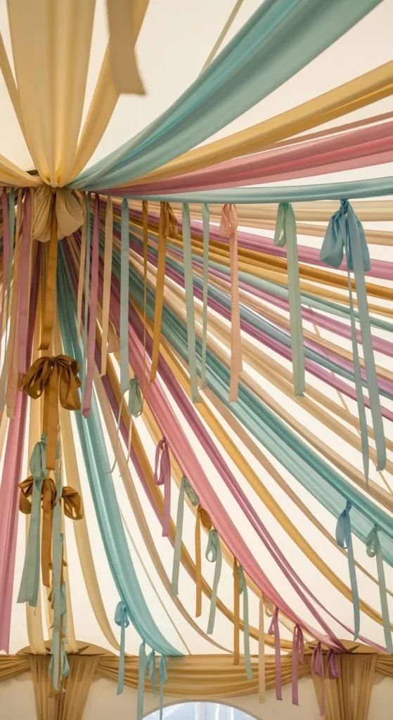 Ribbon canopies feel festive and free-spirited. Use varying shades of your wedding palette for visual movement. They photograph beautifully when wind catches the fabric. Perfect for outdoor receptions and boho-style weddings.