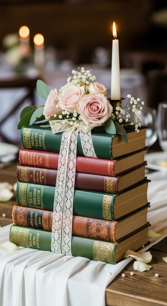 Book centerpieces bring literary charm. Ideal for readers or writers, they add personality and texture. Thrift old books in matching tones and tie them with ribbon. Add flowers or candles for softness.