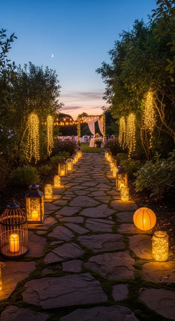 Path lighting guides guests and adds enchantment. Combine lanterns, candles, or string lights. Solar options make setup easy. The glowing path creates a romantic sense of direction, perfect for evening celebrations.