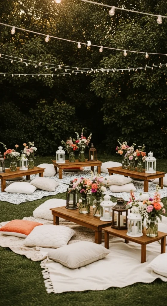 A blanket lounge invites relaxation. Great for garden or beach weddings, it encourages guests to sit, chat, and unwind. Use layered rugs, poufs, and soft throws. It’s informal yet thoughtful, especially for outdoor celebrations.