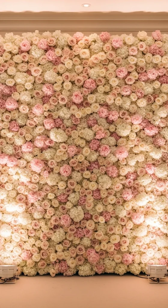 Flower walls create showstopping backdrops. Use silk flowers to cut costs while maintaining texture. Place it behind your sweetheart table or photo area. The lush display instantly adds luxury and depth to your decor.
