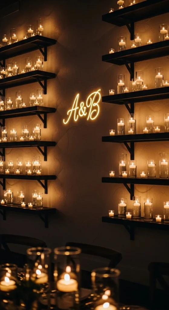A candle wall sets a breathtaking mood. Arrange varying heights for dimension. Add a monogram or initials in the center for personalization. It’s ambient, warm, and beautifully cinematic in evening light.