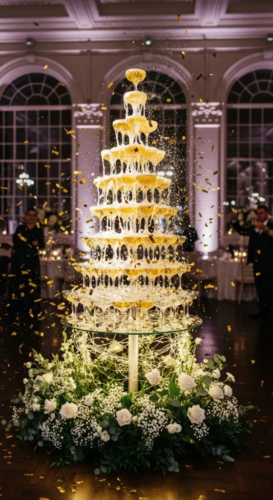 A champagne tower feels timeless and celebratory. Pour the top glass as photographers capture the moment. Surround with candles or metallic decor for extra shine. It’s a fun, photo-worthy centerpiece that screams “celebration.”